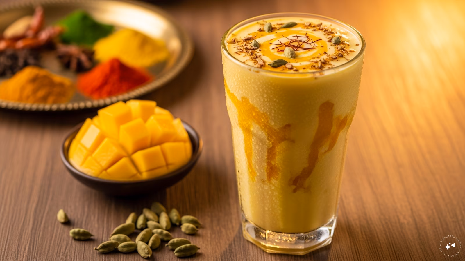मैंगो लस्सी: यह प्रतिष्ठित उत्तर भारतीय व्यंजन पके आम के गूदे को गाढ़े दही और थोड़ी सी चीनी के साथ मिश्रित करता है। सुगंधित इलायची से युक्त और केसर से सजाकर, यह एक मलाईदार, प्रोबायोटिक-समृद्ध भोग प्रदान करता है जो मसाला-भारी भोजन को पूरी तरह से संतुलित करता है और तुरंत ठंडक प्रदान करता है। (छवि: एआई जेनरेटेड)