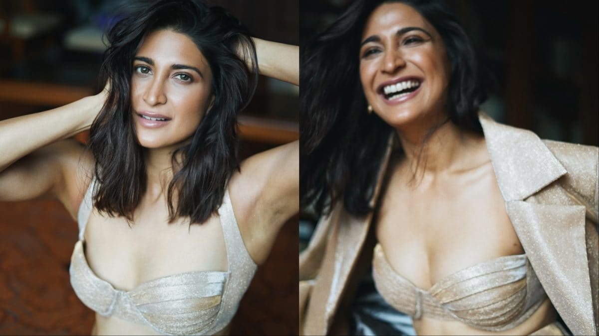 शूटिंग के लिए, अहना कुमरा ने एक शानदार, गोल्ड-बीग थ्री-पीस को-ऑर्ड सेट किया, जो शांत अस्पष्टता को विकीर्ण करता है। आउटफिट में एक चमकदार ब्राल्ट टॉप दिखाई दिया, जो नरम प्रकाश के तहत झिलमिलाता था, जो उच्च-कमर वाले बॉटम्स और एक खुले-सुसज्जित जैकेट के साथ जोड़ा जाता था, जिसने पहनावा की तरलता के लिए संरचना को पेश किया। सिल्हूट ने परिष्कृत सिलाई के साथ आधुनिक कामुकता को संतुलित किया, ग्लैमरस न्यूनतावाद पर एक ताजा लेने की पेशकश की।