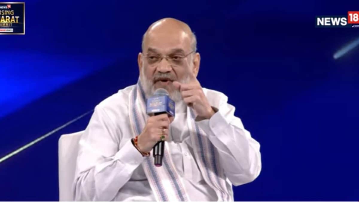 केंद्रीय गृह मंत्री अमित शाह ने 9 अप्रैल को राइजिंग भारत शिखर सम्मेलन 2025 के दूसरे दिन के दौरान बात की। (छवि: News18)