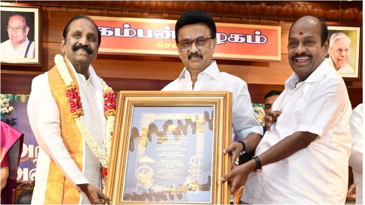 कवि (चरम बाएं) ने अपनी व्याख्या में कांबर को एक दिव्य स्थिति तक पहुंचाते हुए राम मानव प्रदान किया। (फोटो x @vairamuthu)