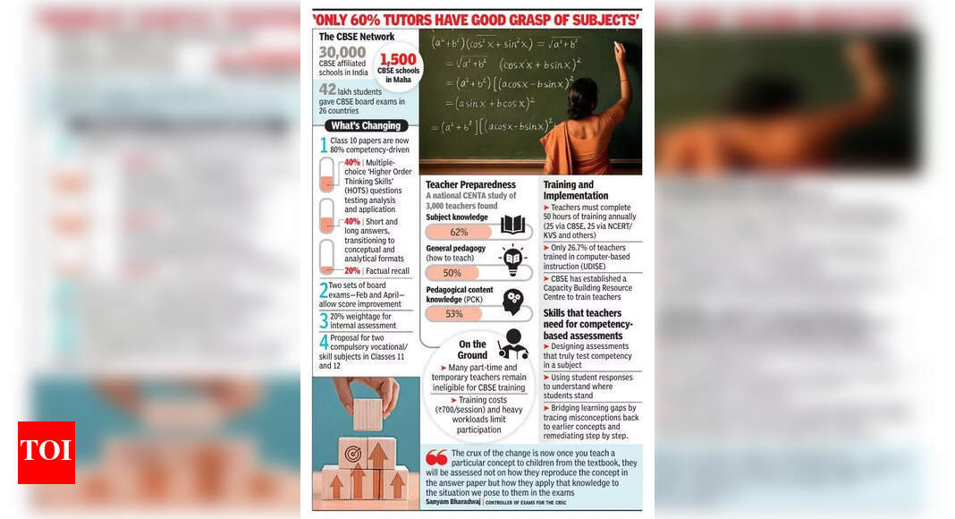 मुंबई: सीबीएसई बोर्ड परीक्षाओं में आमूल-चूल परिवर्तन होने वाला है – स्मृति-आधारित प्रश्नों से हटकर उन परीक्षणों की ओर जो समझ, विश्लेषण और वास्तविक दुनिया के अनुप्रयोग का आकलन करते हैं।जबकि छात्रों से अपेक्षा की जाती है कि वे शीघ्रता से अनुकूलन करें, एक बड़ा प्रश्न सामने है: क्या शिक्षक बदलाव के लिए तैयार हैं?केंद्रीय माध्यमिक शिक्षा बोर्ड (सीबीएसई) द्वारा चरणबद्ध की जा रही एक नई परीक्षा संरचना, रटकर याद करने के दशकों पुराने पैटर्न की जगह, कक्षा 10 के 80% पेपर को योग्यता-संचालित बनाएगी। लगभग 40% अंक अब 'हायर ऑर्डर थिंकिंग स्किल्स' (HOTS) से आएंगे – बहुविकल्पीय आइटम जो विश्लेषण और अनुप्रयोग का परीक्षण करते हैं – अन्य 40% छोटे और लंबे उत्तर वाले प्रश्नों से होंगे जो वैचारिक समझ को मापने के लिए डिज़ाइन किए गए हैं, और केवल 20% तथ्यात्मक स्मरण से आएंगे।यह कदम राष्ट्रीय शिक्षा नीति (एनईपी) 2020 के स्कूल मूल्यांकन को ज्ञान-आधारित से योग्यता- और कौशल-आधारित शिक्षा में स्थानांतरित करने के निर्देश का पालन करता है। यह नीति वैचारिक स्पष्टता, वास्तविक दुनिया में अनुप्रयोग और रटने की बजाय आलोचनात्मक सोच पर जोर देती है।इस बदलाव का समर्थन करने के लिए, सीबीएसई ने कई सुधार पेश किए हैं – जिनमें हर साल दो बोर्ड परीक्षाएं, आंतरिक मूल्यांकन के लिए 20% वेटेज और कक्षा 11 और 12 में दो व्यावसायिक विषयों को अनिवार्य बनाने की योजना शामिल है, जैसा कि हाल ही में केंद्रीय शिक्षा मंत्री धर्मेंद्र प्रधान ने आईआईटी मद्रास में घोषणा की थी।फिर भी, सिस्टम की सफलता शिक्षकों की सीखने-आधारित प्रश्नों को डिजाइन करने और उनका मूल्यांकन करने की क्षमता पर निर्भर करती है – एक ऐसा कौशल जिसकी वर्तमान में कई लोगों में कमी है। सेंटर फॉर टीचर एक्रीडेशन (CENTA) द्वारा विभिन्न विषयों और स्कूल प्रकारों के 3,000 शिक्षकों को शामिल करते हुए एक राष्ट्रव्यापी अध्ययन से पता चलता है कि विषय ज्ञान में औसत स्कोर 62% था, जो सामान्य शिक्षाशास्त्र – या कैसे पढ़ाया जाए, के लिए गिरकर 50% हो गया।शैक्षणिक सामग्री ज्ञान (पीसीके) में, जो शिक्षण विधियों के साथ विषय निपुणता को जोड़ता है, औसत 53% था। ये स्कोर शिक्षकों के लिए राष्ट्रीय व्यावसायिक मानक (एनपीएसटी) बेंचमार्क से काफी कम हैं, जिसके लिए एक शिक्षक को ग्रेड 1 के रूप में अर्हता प्राप्त करने के लिए कम से कम 75% योग्यता की आवश्यकता होती है।CENTA के सीईओ राम्या वेंकटरमन ने कहा, “कुछ शिक्षक विषय अवधारणाओं और अनुप्रयोग के साथ संघर्ष करते हैं, जबकि अन्य सिद्धांत में शिक्षाशास्त्र को समझते हैं लेकिन इसे कक्षा अभ्यास में अनुवाद नहीं कर पाते हैं। यदि छात्रों को योग्यता-आधारित मूल्यांकन के लिए तैयार करना है तो यह अंतर महत्वपूर्ण है।” 