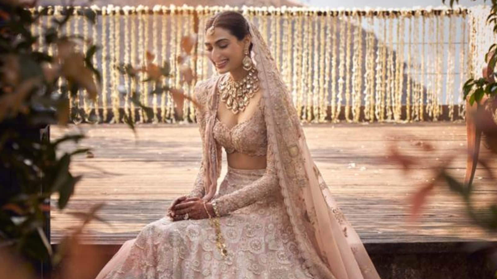 फैशन डिजाइनर अनामिका खन्ना द्वारा डिजाइन किए गए गुलाब-गुलाबी ब्राइडल लहंगे में अथिया शेट्टी। (छवि: रोहन श्रेष्ठ)