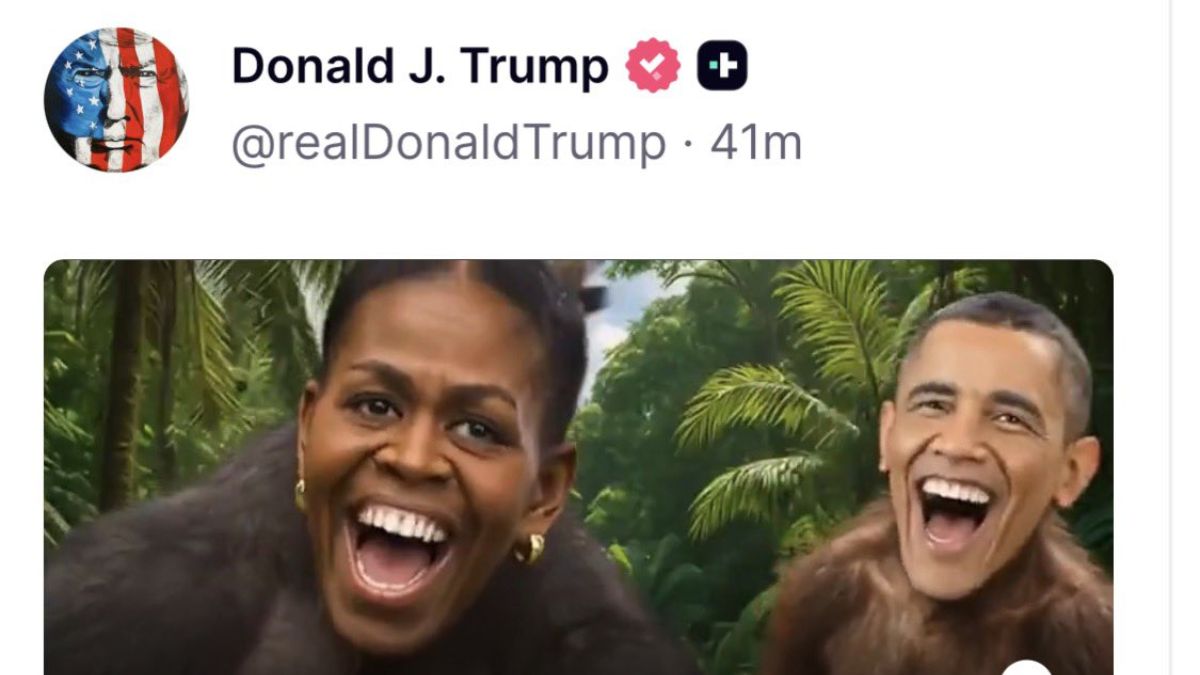 वाशिंगटन: अमेरिका के राष्ट्रपति डोनाल्ड हिटलर के एक सोशल मीडिया पोस्ट ने हंगामा खड़ा कर दिया है। अचल ने अपना ट्रथ सोशल मीडिया पर एक ऐसा नस्लवादी पोस्ट किया, जिसमें पूर्व राष्ट्रपति बराक ओबामा और उनकी पत्नी मिशेल ओबामा को जंगल में प्राइमेट्स (वानरों) के रूप में दिखाया गया था। इससे अमेरिका में भारी बवाल हो गया। हालाँकि बैकलैश के बाद उस वीडियो को डार्क के क्रॉवल से डिलीट कर दिया गया। फिर भी मामला अभी थमा नहीं है।