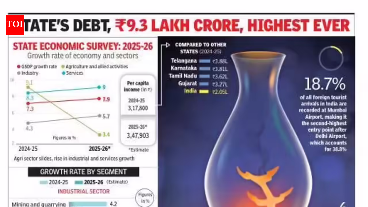 मुंबई: गुरुवार को राज्य विधानमंडल में पेश किए गए 2025-26 के लिए महाराष्ट्र के आर्थिक सर्वेक्षण के अनुसार, राज्य की आर्थिक विकास दर 2024-25 में 7.3% से बढ़कर 2025-26 में 7.9% हो जाएगी। बेमौसम बारिश और बाढ़ के कारण कृषि क्षेत्र में भारी गिरावट की भरपाई औद्योगिक और सेवा क्षेत्रों में तेजी से हुई है। राज्य की अनुमानित विकास दर राष्ट्रीय विकास दर 7.4% से अधिक है।राज्य की प्रति व्यक्ति आय 2025-26 तक 3,17,800 रुपये से बढ़कर 3,47,903 रुपये हो जाएगी। यह राष्ट्रीय प्रति व्यक्ति आय अनुमानित 2,19,575 रुपये से अधिक है। हालांकि 2024-25 के नवीनतम आंकड़े बताते हैं कि प्रति व्यक्ति आय के मामले में महाराष्ट्र देश में तेलंगाना, कर्नाटक, तमिलनाडु और गुजरात के बाद 5वें स्थान पर है।सर्वेक्षण से पता चलता है कि कृषि और संबद्ध सेवा क्षेत्र में अनुमानित वृद्धि दर 2024-25 में 9.1% से घटकर 2025-26 में 3.4% हो जाएगी। इसके विपरीत, इसी अवधि के दौरान औद्योगिक विकास दर 4.3% से बढ़कर 5.7% हो जाएगी और सेवा क्षेत्र में अपेक्षित विकास दर 8.3% से बढ़कर 9% हो जाएगी। कृषि की तुलना में आर्थिक विकास की गणना में औद्योगिक और सेवा क्षेत्र का महत्व बहुत अधिक है। 2025 में राज्य के 42% हिस्से में अधिक बारिश हुई, जिससे फसलें नष्ट हो गईं। इसके अलावा, राज्य का एक हिस्सा असामयिक बारिश और ओलावृष्टि से भी प्रभावित हुआ। आपदाओं ने कृषि विकास को धीमा कर दिया, मुख्य ख़रीफ़ फसल के साथ दालों के उत्पादन में 28% की गिरावट और तिलहन उत्पादन में 47.4% की गिरावट देखी गई।“विनिर्माण और निर्माण उप-क्षेत्रों में अपेक्षित वृद्धि के कारण उद्योग क्षेत्र ने विकास की गति बनाए रखी। सेवा क्षेत्र राज्य की अर्थव्यवस्था का एक उत्साहजनक क्षेत्र बना हुआ है, “सर्वेक्षण में कहा गया है,” चालू वित्त वर्ष के दौरान एक अनुकूल मूल्य वातावरण और रिकॉर्ड जीएसटी संग्रह ने राज्य की विकास गति का समर्थन किया है।उद्योग क्षेत्र के भीतर, जिसे अक्सर विपक्ष द्वारा निशाना बनाया जाता है, विनिर्माण क्षेत्र में वृद्धि दर 2024-25 में 4.1% से बढ़कर 2025-26 में 5.9% हो जाएगी, जबकि निर्माण क्षेत्र में इसी अवधि के दौरान 6.3% से बढ़कर 7.8% हो जाएगी। बिजली, जल आपूर्ति और उपयोगिता क्षेत्र में विकास दर 1.1% से बढ़कर 5.8% होने का अनुमान है। हालाँकि, खनन और उत्खनन क्षेत्र की विकास दर में 4.2% से 0.2% की गिरावट देखने की उम्मीद है।सेवा क्षेत्र में, व्यापार, होटल, परिवहन और संचार के क्षेत्र में विकास दर 6.2% से बढ़कर 8.3% होने का अनुमान है, जबकि वित्तीय सेवाओं और रियल एस्टेट क्षेत्र में विकास दर केवल 9% से बढ़कर 9.1% होने की उम्मीद है। सार्वजनिक प्रशासन, रक्षा और अन्य सेवा क्षेत्र में सबसे तेज वृद्धि की उम्मीद है, जिसमें 8.8% से 9.9% की वृद्धि देखी जाएगी।फिर भी, विकास में वृद्धि के बावजूद, राज्य के भीतर गहरी असमानताए
