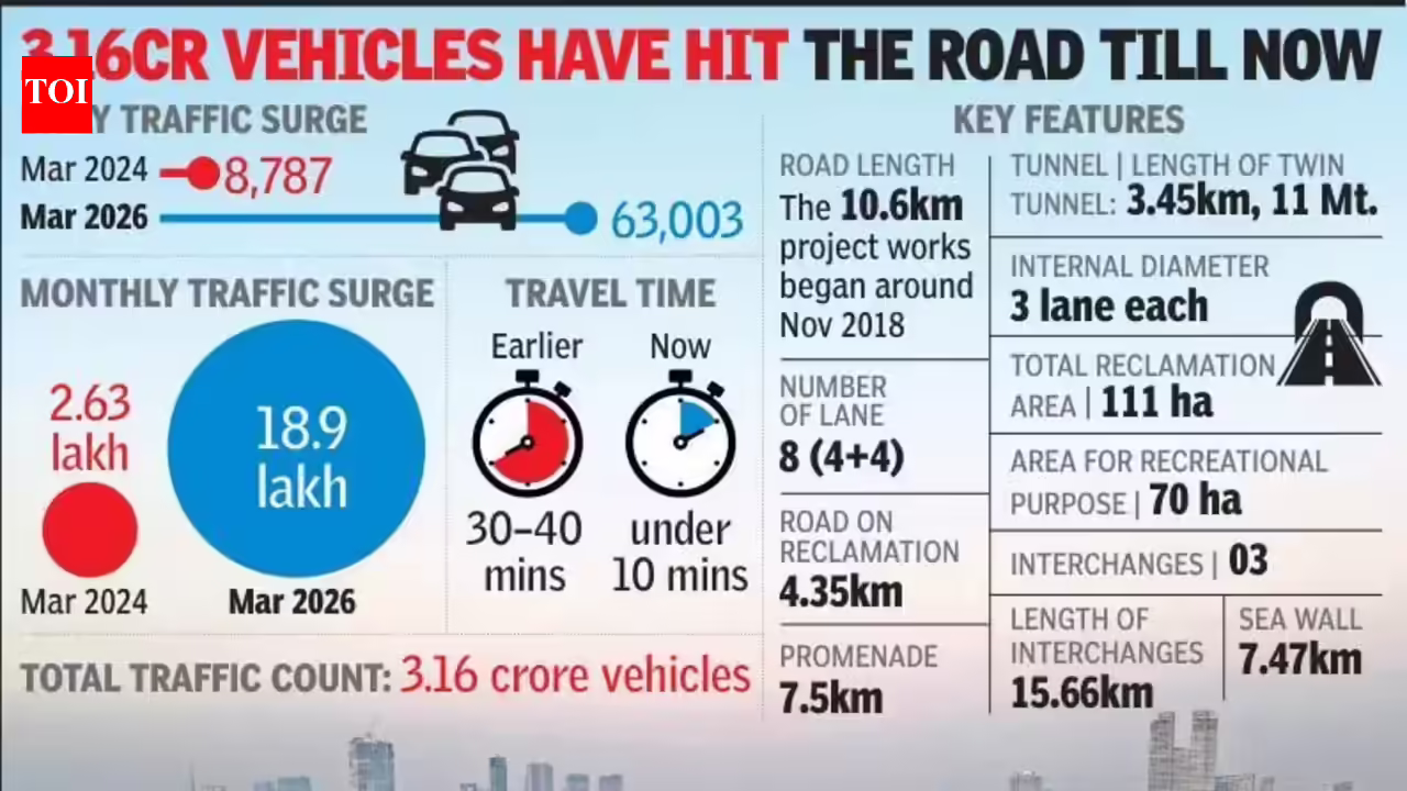 मुंबई: मुंबई के कोस्टल रोड-साउथ पर यातायात में भारी वृद्धि देखी गई है, लगभग दो साल पहले मार्च 2024 में लॉन्च होने के बाद से इसका उपयोग लगभग सात गुना बढ़ गया है। सड़क शुरू होने के बाद से टीओआई ने मासिक डेटा का विश्लेषण किया है, जिससे पता चलता है कि पहले महीने में औसतन 8,787 वाहनों ने सड़क का उपयोग किया था, यह संख्या 63,003 (मार्च 2026) हो गई है।2024 में लोकसभा चुनाव से ठीक पहले खुलने के बाद से दो वर्षों में कुल मिलाकर 3.16 करोड़ वाहनों ने इस मार्ग का उपयोग किया है। आधिकारिक तौर पर धर्मवीर स्वराज रक्षक छत्रपति शंबाजी मुंबई कोस्टल रोड नाम दिया गया है, 13,893 करोड़ रुपये के हाई-स्पीड कॉरिडोर ने मरीन ड्राइव और वर्ली के बीच यात्रा के समय को पहले के 30-40 मिनट से घटाकर 10 मिनट से भी कम कर दिया है।संचालन के पहले महीने में – मार्च 2024 – सड़क पर 2.63 लाख वाहन आए, औसतन 8,787 दैनिक यात्राएँ, क्योंकि इसे महीने के मध्य में खोला गया था। अगले महीने, अप्रैल 2024 में 4.36 लाख वाहनों या प्रतिदिन 14,538 वाहनों की वृद्धि दर्ज की गई। हालाँकि, वास्तविक उछाल समय के साथ आया है। मार्च 2026 तक, औसत दैनिक यातायात 63,003 वाहनों तक पहुंच गया था, जबकि मासिक संख्या 18.9 लाख तक पहुंच गई थी। नागरिक अधिकारी अगस्त 2025 से चौबीसों घंटे पूरी तरह से चालू होने वाली सड़क को तेज वृद्धि का श्रेय देते हैं। अधिकारियों ने कहा कि पिछले साल स्वतंत्रता दिवस से, सड़क को पूरी तरह से चालू कर दिया गया था और समुद्र के सामने वाले सैरगाह को भी जनता के लिए खोल दिया गया था, जिससे और भी बड़ी भीड़ उमड़ी थी। अगस्त 2025 तक, दैनिक यातायात 45,961 वाहन था, जिसका मासिक कुल योग 13.78 लाख था।एक वास्तुकार और शहरी योजनाकार, विवेक पई ने कहा कि कोस्टल रोड और मेट्रो ने दक्षिण मुंबई में गतिशीलता को मौलिक रूप से नया आकार दिया है, जिसका मुख्य कारण कॉरिडोर द्वारा प्रदान किया जाने वाला सिग्नल-मुक्त आवागमन है। “हालांकि, लाभ मुख्य रूप से कार मालिकों और उन लोगों को मिला है जो निजी टैक्सियां खरीद सकते हैं। कोस्टल रोड पर अधिक BEST बस सेवाएं शुरू करने की तत्काल आवश्यकता है ताकि आम यात्री वंचित न रहें,” पई ने कहा, उन्होंने कहा कि दक्षिण मुंबई और बांद्रा के बीच यात्रा स्पष्ट रूप से निर्बाध हो गई है। अप्रैल 2016 की एक विस्तृत परियोजना रिपोर्ट में कारों, दोपहिया वाहनों और बसों को ध्यान में रखते हुए 2043 तक प्रति वर्ष 2% की कुल यातायात वृद्धि दर का अनुमान लगाया गया था। हालाँकि, वर्तमान में तटीय सड़क पर दोपहिया वाहनों को अनुमति नहीं है, जिससे उन अनुमानों को रेखांकित करने वाली धारणाओं पर सवाल उठ रहे हैं।ब्रीच कैंडी निवासी निगम लखानी, जिन्होंने कोस्टल रोड को कई चरणों में खुलते हुए देखा है, ने कहा कि इसके शुरुआती दिनों में “खुशी की सवारी” में वृद्धि देखी गई। उन
