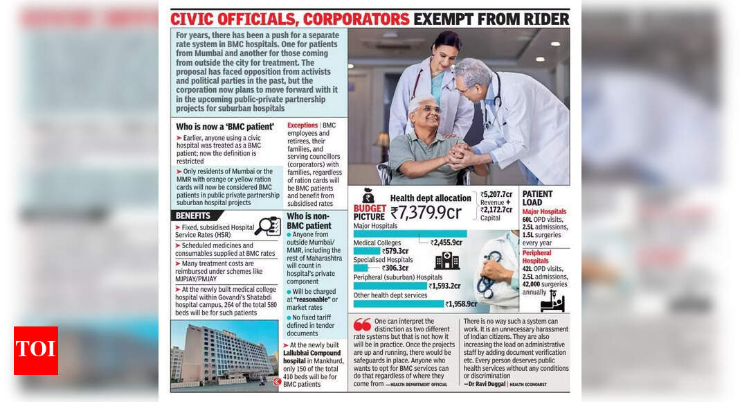 मुंबई: मुंबई में, जहां नागरिक अस्पताल लंबे समय से न केवल शहर के निवासियों के लिए बल्कि महाराष्ट्र और उससे आगे के बाकी हिस्सों के लिए भी अंतिम उपाय रहे हैं, बृहानमंबई नगर निगम (बीएमसी) उन लोगों के बीच एक तेज रेखा खींचने वाले हैं, जो सस्ती उपचार का लाभ प्राप्त करेंगे और जो लोग नहीं करेंगे।पहली बार, एक स्पष्ट परिभाषा है कि कौन 'बीएमसी रोगी' के रूप में अर्हता प्राप्त करता है, एक सार्वजनिक-निजी साझेदारी के आधार पर उपनगरीय अस्पतालों को चलाने के लिए निगम की योजनाओं के दस्तावेजों में दफन किया गया है। केवल मुंबई और मुंबई मेट्रोपॉलिटन क्षेत्र में पीले या नारंगी राशन कार्ड के साथ रहने वालों को इन सभी परियोजनाओं में बीएमसी रोगी माना जाएगा।ऐसे रोगी बीएमसी दरों पर उपचार और निदान के लिए पात्र होंगे, इस प्रकार राज्य या देश के अन्य हिस्सों से रोगियों को छोड़कर जो उपचार के लिए शहर का दौरा करते हैं – प्रभावी रूप से निजी भागीदार के लाभों के लिए एक अंतर दर प्रणाली का निर्माण करते हैं। पिछले अनुमानों के अनुसार, शहर और उपनगरीय अस्पतालों में आने वाले सभी रोगियों में से 30% मुंबई के बाहर से हैं। दिलचस्प बात यह है कि बीएमसी के कर्मचारी और उनके परिवार, जिसमें सेवानिवृत्त लोगों, साथ ही कॉरपोरेटर्स और उनके परिवार शामिल हैं, बिना किसी राशन कार्ड राइडर के इन अस्पतालों में बीएमसी दरों पर उपचार का लाभ उठा सकेंगे।मार्च में, बीएमसी ने अपने कुछ उपनगरीय अस्पतालों को चलाने के लिए अभिव्यक्ति के भाव (ईओआई) को कॉल करना शुरू कर दिया। एक महीने पहले, फरवरी में, महाराष्ट्र नवनीरमैन सेना (MNS) ने चार प्रमुख मेडिकल कॉलेज अस्पतालों में एक समान अंतर दर प्रणाली के लिए धक्का दिया, लेकिन 'दूसरों' के बारे में उनका विचार राज्य के बाहर से था। “हम चाहते थे कि महाराष्ट्र के बाहर के लोग, जैसे यूपी, बिहार और मध्य प्रदेश में अलग -अलग दरें हो। मुंबई महाराष्ट्र की राजधानी है, और यहां रहने वाले लोगों को अपने संसाधनों का पहला अधिकार होना चाहिए। एमएनएस मुंबई के प्रमुख संदीप देशपांडे ने कहा, “हम इस तरह की सार्वजनिक-निजी भागीदारी परियोजनाओं के विरोध में हैं, क्योंकि वे अतीत में असफलता साबित हुए हैं।स्वास्थ्य अर्थशास्त्री डॉ। रवि दुग्गल ने कहा कि चाहे जो भी रहता हो, जहां, सार्वजनिक स्वास्थ्य सेवाओं के लिए समान पहुंच एक मौलिक अधिकार है। “यह अव्यवहारिक भी है और दस्तावेज़ सत्यापन के प्रशासनिक बोझ को जोड़ता है। बीएमसी सबसे अमीर नागरिक निकायों में से एक है, और उन्हें विफल होने के लिए निर्धारित परियोजनाओं के लिए निजी खिलाड़ियों का पीछा करने के बजाय स्वास्थ्य पर खर्च बढ़ाने की आवश्यकता है।”यह पहली बार नहीं है जब बीएमसी ने अंतर दरों को लागू करने की कोश