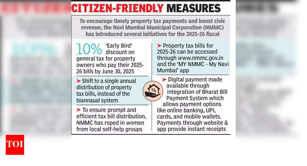 नवी मुंबई: 2024-25 में संपत्ति कर में 826 करोड़ रुपये का रिकॉर्ड एकत्र करने और 2025-26 के राजकोषीय के लिए 1,200 करोड़ रुपये का महत्वाकांक्षी लक्ष्य निर्धारित करने के बाद, नवी मुंबई म्यूनिसिपल कॉरपोरेशन (एनएमएमसी) ने जून 30 द्वारा अपने 2025-26 बिलों का भुगतान करने वाले संपत्ति के मालिकों के लिए 10% 'अर्ली बर्ड' छूट की घोषणा की। एनएमएमसी आयुक्त कैलास शिंदे ने कहा कि 2025-26 संपत्ति कर बिल अब ऑनलाइन सुलभ हैं। समय पर कर भुगतान को प्रोत्साहित करने और नागरिक राजस्व को बढ़ावा देने के लिए अन्य पहलों में 2025-26 से एकल वार्षिक बिल वितरण प्रणाली का कार्यान्वयन है, जो वर्ष में दो बार बिल वितरित करने के पहले अभ्यास को बदल देता है। एनएमएमसी ने ऑनलाइन भुगतान प्रणाली को भी अपग्रेड किया है और भौतिक बिल वितरण को संभालने के लिए स्व-सहायता समूहों की महिलाओं में रोप किया गया है।“2025-26 के लिए संपत्ति कर बिल अब www.nmmc.gov.in और 'माई एनएमएमसी – माई नेवी मुंबई' ऐप के माध्यम से एक्सेस किया जा सकता है। सामान्य कर पर 10% की छूट उन लोगों का इंतजार करती है जो 30 जून, 2025 तक अपने बिलों का निपटान करते हैं,” शिंदे ने कहा। “पहले, निगम ने सालाना 3.5 लाख से अधिक संपत्ति मालिकों को दो बार बिल वितरित किए। लिमिटेड स्टाफ ने वितरण और कर संग्रह में देरी का कारण बना। इसलिए, मैंने अतिरिक्त कर्मियों के साथ स्विफ्ट वितरण का निर्देश दिया है, एक एकल वार्षिक वितरण प्रणाली को लागू करते हुए। संपत्ति कर विभाग ने त्वरित बिल वितरण सुनिश्चित करने और निवासियों को कर रियायत योजनाओं के बारे में सूचित करने के लिए स्व-सहायता समूहों से महिलाओं को भर्ती किया है। निवासियों को सलाह दी जाती है कि वे अपने मोबाइल फोन नंबर और ईमेल पते को इन प्रतिनिधियों के साथ संपत्ति लिंकिंग और एसएमएस अलर्ट के लिए साझा करें। नागरिक भी इस प्रक्रिया को www.nmmc.gov.in के माध्यम से स्वतंत्र रूप से पूरा कर सकते हैं। भारत बिल भुगतान प्रणाली ऑनलाइन बैंकिंग, यूपीआई, कार्ड और मोबाइल वॉलेट सहित विभिन्न भुगतान विकल्पों का समर्थन करती है। एनएमएमसी के एक अधिकारी ने पुष्टि की कि नगरपालिका वेबसाइट और ऐप के माध्यम से भुगतान तत्काल प्राप्तियां प्रदान करते हैं। NMMC अब वार्षिक बिलिंग के साथ मैन्युअल रूप से और ऑनलाइन दोनों सीधे संपत्ति कर भुगतान प्रदान करता है।संपत्ति कर संग्रह में सुधारों के बारे में बोलते हुए और सार्वजनिक सहयोग को प्रोत्साहित करने के लिए, शिंदे ने कहा: “इस साल, संपत्ति कर संग्रह को अधिक गतिशील और नागरिक-अनुकूल बनाने के लिए कई महत्वपूर्ण निर्णय लिए गए थे। 'एक वर्ष, एक बिल' की नई प्रणाली, केवाईसी को कर बिलों से ऑनलाइन उपलब्धता, भी कर बिलों की उपलब्धता, और भी बिलों से मिलती है। कर संग्रह के लिए।“