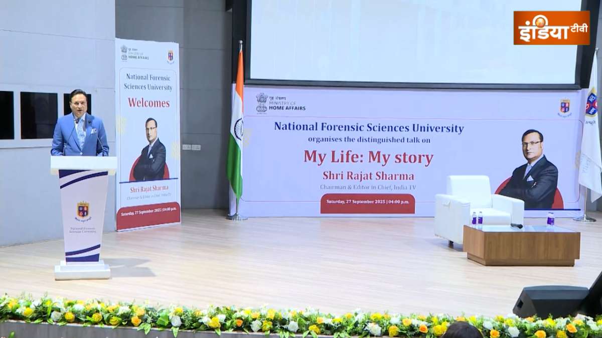 भारत के टीवी के अध्यक्ष और प्रधान संपादक रजत शर्मा ने शनिवार को गुजरात के गांधीनगर में नेशनल फोरेंसिक साइंस यूनिवर्सिटी में एक कार्यक्रम के दौरान मुख्य अतिथि के रूप में 'माई लाइफ: माई स्टोरी' पर एक विशेष संबोधन दिया। कार्यक्रम के दौरान, उन्हें विश्वविद्यालय द्वारा सम्मानित किया गया। रजत शर्मा ने अपने जीवन के बारे में लंबाई में बात की, अपने शुरुआती वर्षों के संघर्षों को याद करते हुए और अपने लोकप्रिय टीवी शो एएपी की एडलत की कहानी साझा किया। इवेंट के दौरान शो का एक वीडियो भी खेला गया था।