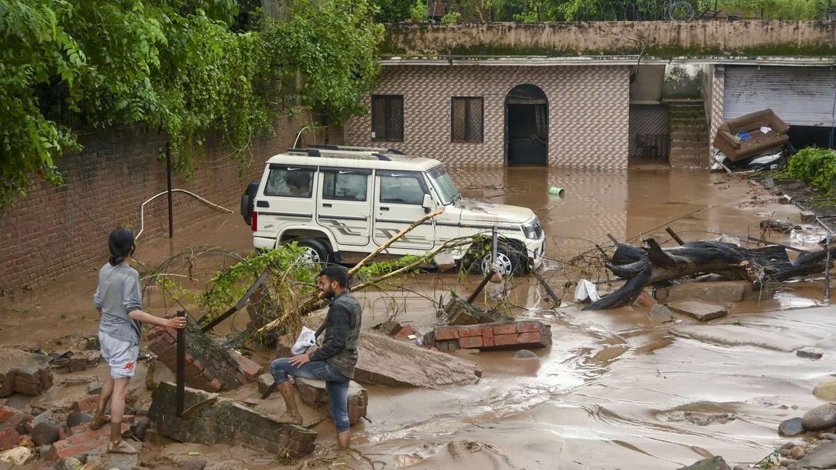 तवी नदी में जलस्तर बढ़ने के बीच एक पुल का एक हिस्सा बह जाने के बाद मलबे के बीच क्षतिग्रस्त पड़ी कार।