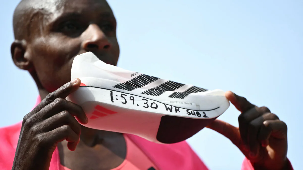 केन्या के सबस्टियन सावे ने 26 अप्रैल, 2026 को मध्य लंदन में 2026 लंदन मैराथन के समापन पर अपने दौड़ने वाले जूते पर लिखे नए विश्व रिकॉर्ड समय के साथ पोज़ दिया। केन्या के सबास्टियन सावे ने रविवार को लंदन मैराथन जीतकर इतिहास में पहली बार दो घंटे का समय तोड़ा।