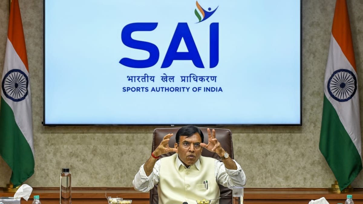 केंद्रीय युवा मामलों और खेल मंसुख मंडविया मंत्री एक प्रेस कॉन्फ्रेंस (पीटीआई) को संबोधित करते हैं
