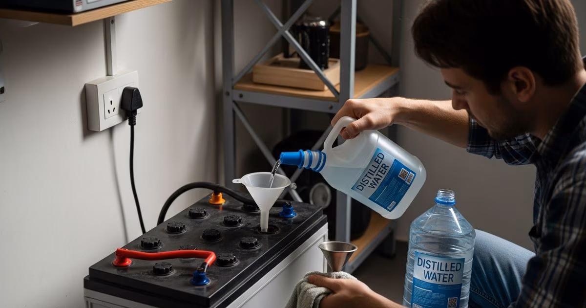 पानी कब और कैसे डालें? हर 2-3 महीने में चेक करो. बैटरी पर मिनिमम और मैक्सिमम लाइन होती है (या ग्रीन-रेड मार्क)। अगर पानी लेना मिनिमम से नीचे है तो पानी देना चाहिए। इन्वर्टर बंद करो, ग्रुप को हटाओ, कैप खोलो (फ़ल यूज़ करो ताकि आसानी से डाला जा सके), धीरे-धीरे डिस्टिल्ड वॉटर डालो, ग्रीन मार्क तक या मैक्सिमम से थोड़ा नीचे। अधिकांश मैट ऑर्डर, अन्य ओवर फ़्लो हो सकते हैं। फिर कैप अच्छे से बंद कर दो.